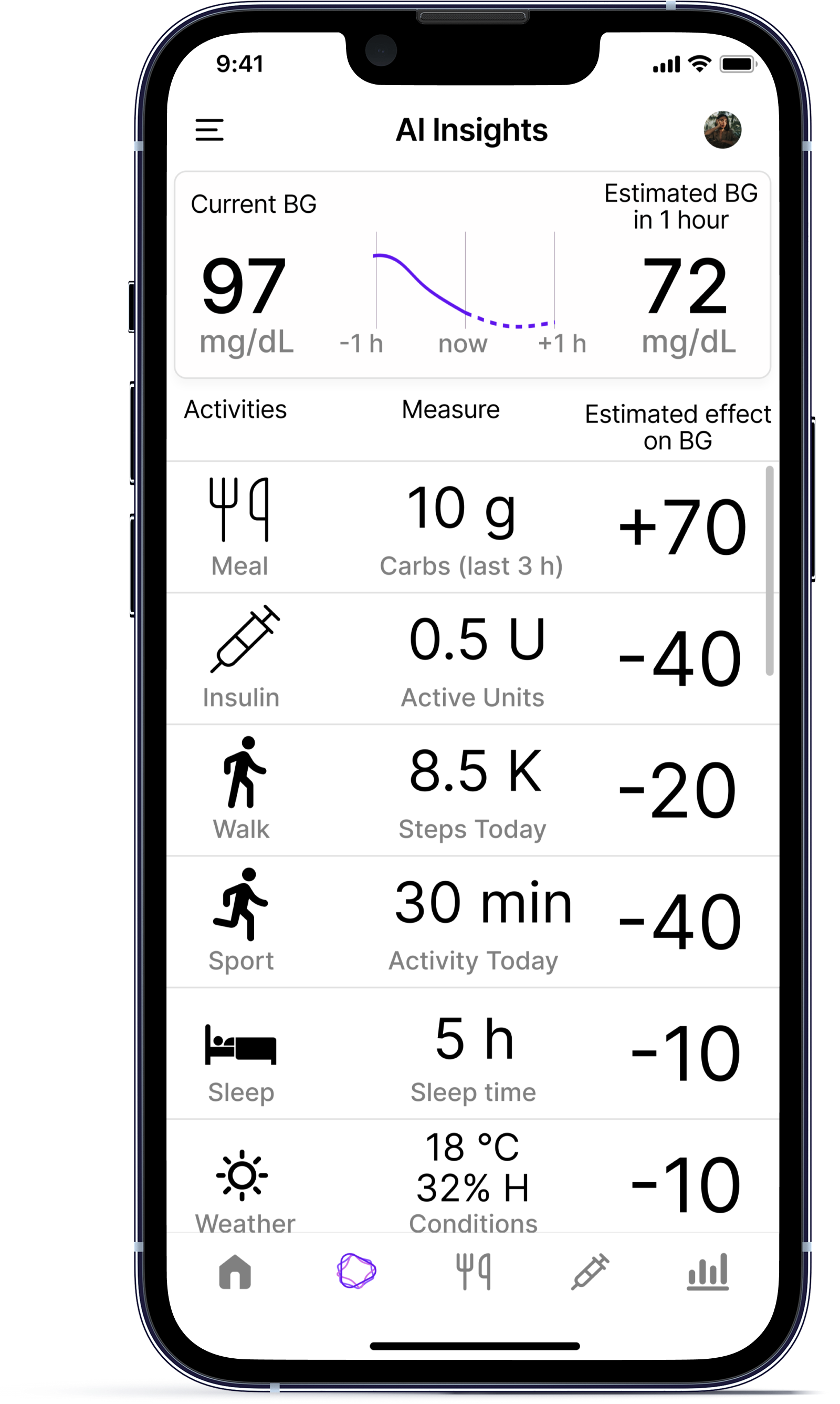 Over time, the AI recognizes patterns in your blood sugar response to food, insulin, activity, and other factors, making its predictions and recommendations personalized for you.